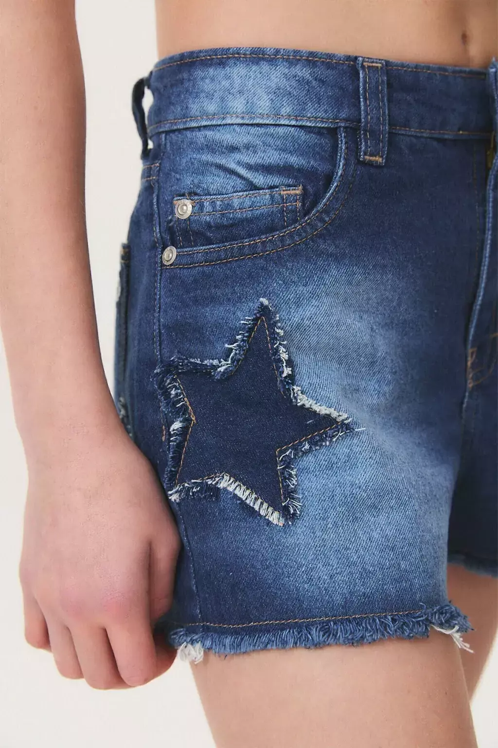 ¡Descubrí este short perfecto para destacar este verano! Este short de denim rígido es la mezcla ideal entre estilo y comodidad. Con un calce amplio que te permite moverte con libertad y un tiro medio que realza tu figura, es la opción ideal para cualquier ocasión casual. Sus cinco bolsillos clásicos añaden un toque práctico y atemporal, mientras que los parches de estrella en el delantero aportan un detalle divertido y súper de moda. ¡Combínalo con tus remeras favoritas!